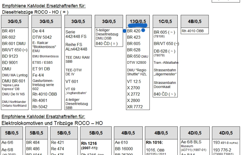 Einer der grossen Vorteile bei der Auswahl der Haftreifen ist, dass KaModell auf ihrer Website die entsprechenden Spezifikationen für gängige Modelle gleich mit zur Verfügung stellt - manchmal sind die Katalog-Nummern angegeben, manchmal auch die Modell-Nummern der Vorbilder. Lästiges Ausmessen von Nuten und Rechnereien sind dadurch nicht nötig. Für den BR 420 - Triebzug sind Haftreifen mit der Artikel-Nr. 13G/0.5 empfohlen [6]: