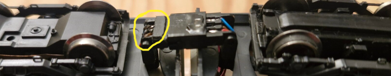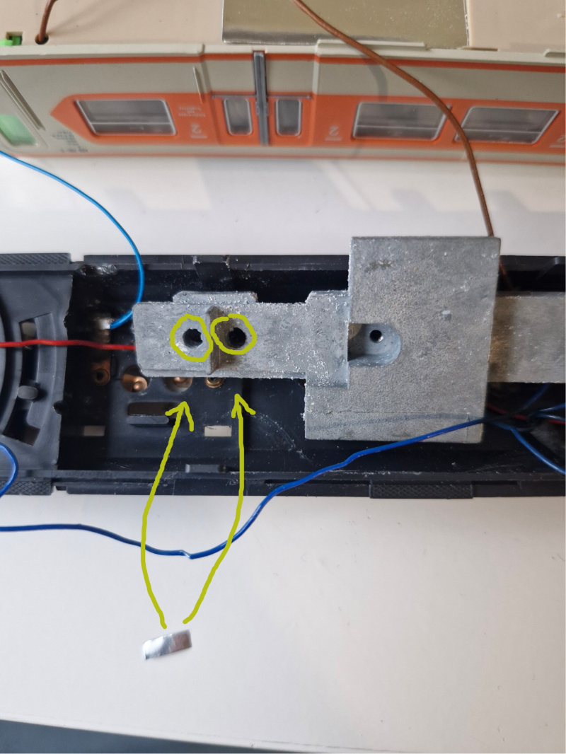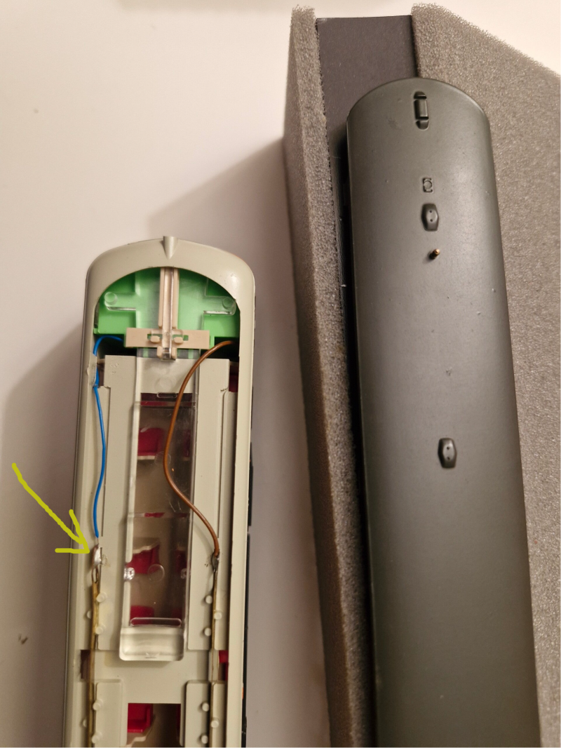 Die Lötkontaktpunkte des blauen und roten Kabels im Steuerwagen befinden sich unter einer Art Schrumpfschlauch, wo sie mit anderen blauen und roten Kabeln zusammengelötet wurden. Die Lötstelle des braunen Kabels befindet sich auf einer kleinen Metallfeder, welche mit dem elektrisch leitenden Metallgewicht verbunden ist.