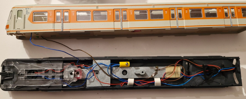 Beim Motorwagen wird die kaputte Lötstelle zwischen Lichtleiste und Motor sogleich dazu genutzt, um die Seitenwände abzumachen und die transparente Fensterleiste von innen wieder festzukleben, die sich bereits teilweise abgelöst hatte. Anschliessend wird alles wieder zusammengesetzt (man muss dazu eine vertikale Schraube auf- und wieder anschrauben), und alle Motor-Verbindungskabel und -Lötstellen werden wieder sauber angelötet.