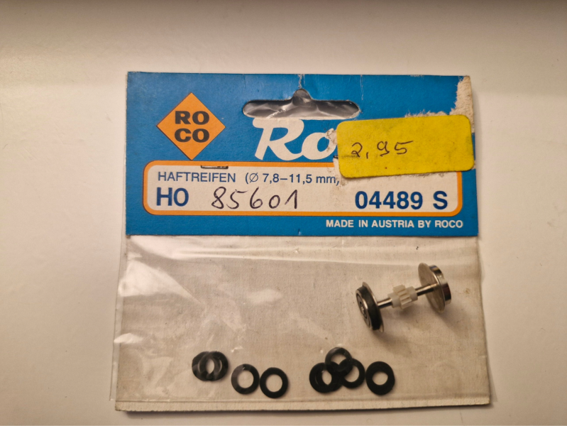 Auch 2 der Haftreifen müssen aufgrund Teil-Auflösung ersetzt werden. Wie jedoch in anderen Projekten bereits erwähnt sind die Original-Ersatz-Haftreifen von Roco für diesen Zweck nur sehr bedingt geeignet: Im Laufe der Jahrzehnte haben die Gummi-Ringe nämlich den Weichmacher verloren (welcher sich als Film auf der Innenseite der Plastiktüte abgelagert hat).