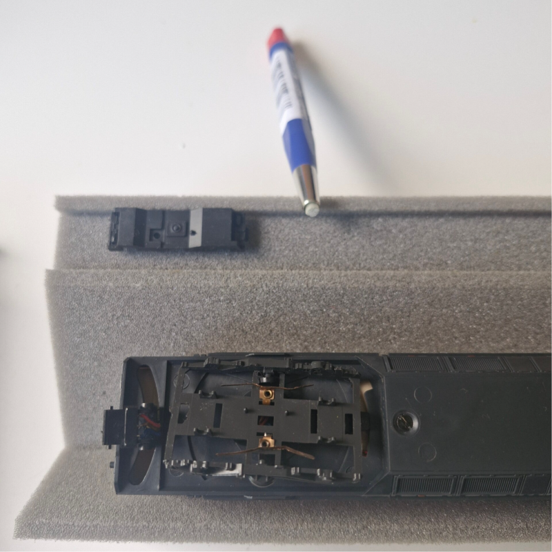 Eine Besonderheit dieser Version des Triebzugs ist, dass sich die Stromabnehmer der Räder nicht auf dem Motorwagen befinden, sondern unter den beiden Steuerwägen: Der Strom wird dann über die stromführenden Kupplungen auf den Motor übertragen. Deshalb muss man bei der Wartung auch die antriebslosen Steuerwägen berücksichtigen und die Stromabnehmer sowie die Laufflächen der Räder entsprechend reinigen: Die Achsen lassen sich durch Abnahme eines Deckels mit Clip-Verbindung zugänglich machen, den man am besten mit einem kleinen Schraubenzieher am vorderen Ende etwas eindrückt und dann aufklappt.