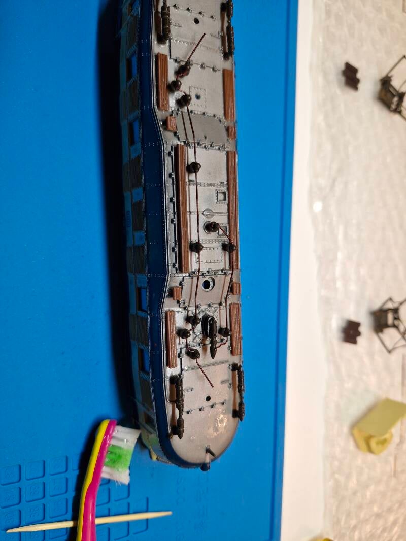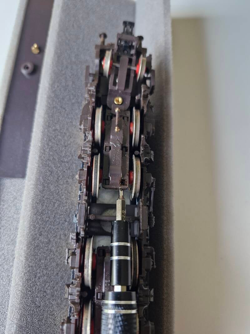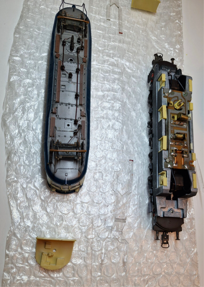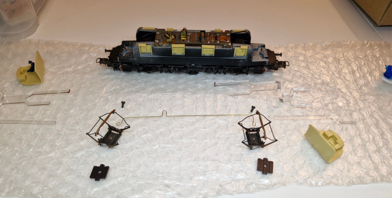 Nach der technischen Instandsetzung werden Gehäuse und Pantographen gereinigt.. dafür muss das Gehäuse abgebaut und zerlegt werden - Fotos der Schritte und Aufbewahrungsdosen für die Kleinteile bieten sich dabei an, damit man nichts vergisst oder verliert. Für wenig Geld kann man sich auch Lokliegen aus festem Schaumstoff-Material kaufen oder selber basteln, welche üblicherweise magnetische Haltebereiche für metallische Kleinteile beinhalten.