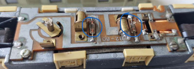 Beim Einfahren auf der Teststrecke ruckelt die Lokomotive etwas, was auf unregelmässige Stromabnahme hindeutet - ein typisches Problem von alten Lokomotiven, die keine blanken Radflächen oder etwas verbogene Stromabnehmer haben. Ausserdem funktioniert nur ein Lichtwechsel, was darauf hindeutet, dass eines der beiden Lämpchen seinen Geist aufgegeben haben. Bei genauerem Hinsehen stellen wir fest, dass sich ausserdem die Ummantelung der Dioden neben den Lämpchen bereits auflöst - ein Austausch dieser Komponenten bietet sich also ebenfalls an.