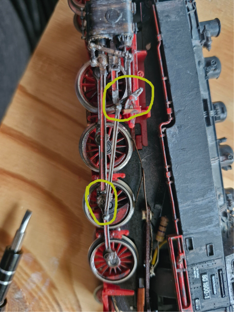 Nun ist es also Zeit, die Lok zu testen: Neben korrekt rotierenden Kurbelstangen erwarten wir nun auch, dass die Lok deutlich besser fährt also zuvor. Bei der ersten Testfahrt war das leider NICHT der Fall! Als Ursache stellte sich bei genauem Hinschauen heraus, dass zwei der vier mittleren Räder von den Schienen abgehoben waren und sich daher die Stromabnahme als sehr schwierig gestaltete. Dies könnte auch der ursächliche Grund für die ursprünglichen Probleme bei der ersten Testfahrt gesehen sein [2].
