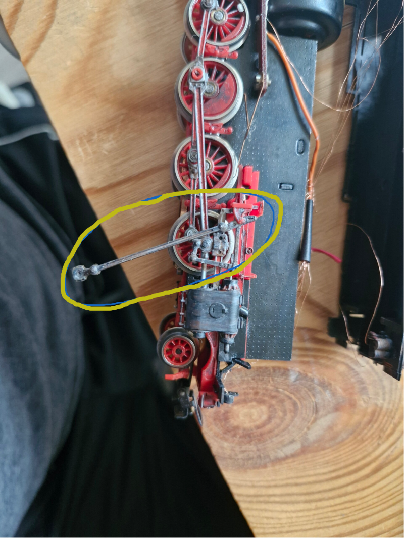 Der zweite Blick auf die Seiten der Lok offenbart jedoch, dass links und rechts jeweils eine der Kurbelstangen fehlt. Diese sind anscheinend abhanden gekommen weil die Plastik-Clips ausgebrochen sind. Nicht ungewöhnlich bei alten Modellen aus Plastik und solch filigranen Bauteilen: Alles, was es braucht, ist ein etwas ungelenker Umgang mit der Lok, da diese Kurbelstangen seitlich etwas hervorstehen - und schon sind die Clips beschädigt.