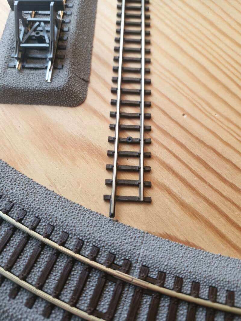 Jetzt wurde zunächst eine der TT-Schienen neben dem H0-Testoval auf der Bastelfläche fix installiert - und zwar möglichst schnurgerade: Mit einem Bohrschleifer und ein paar Schienenschrauben ist die Arbeit sogleich erledigt.