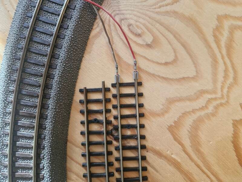 Mit einem weiteren Griff in die Bastelkiste kam auch ein altes Anschlusskabel zum Vorschein welches man mit den Schuhen auf die Schienenstränge schieben konnte, lediglich die Enden mussten abgekappt und neu verlötet werden.