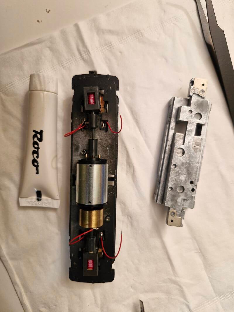 Nun können wir die Bastlerlok sogleich zu einer ersten Testfahrt einladen - und diese war leider nicht erfolgreich [2]: Man hört zwar den Strom durch das System fliessen, die Lok bewegt sich jedoch leider nicht vor-oder rückwärts. Das deutet auf mehrere Probleme hin - die Stromzufuhr ist irgendwo unterbrochen, und die Fahrt durch das Getriebe, das Gestänge (oder beides) blockiert.