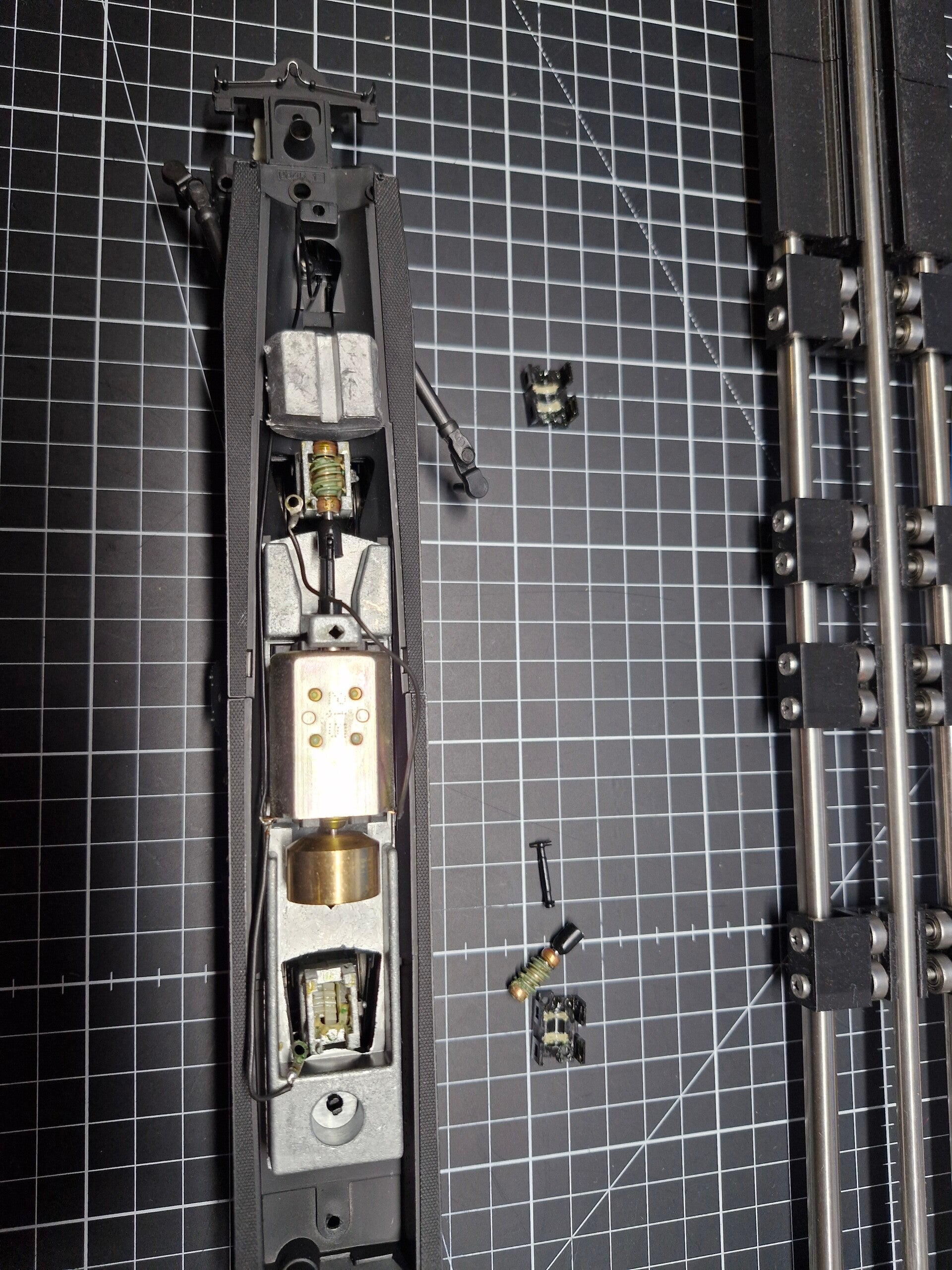 Auch das zweite Ballastgewicht konnte man nun abmachen, da die Befestigungsschraube unter dem vorderen Drehgestell nun für einen Schraubendreher zugänglich wurde.. ebenso wie den Metallrahmen des Motors.
