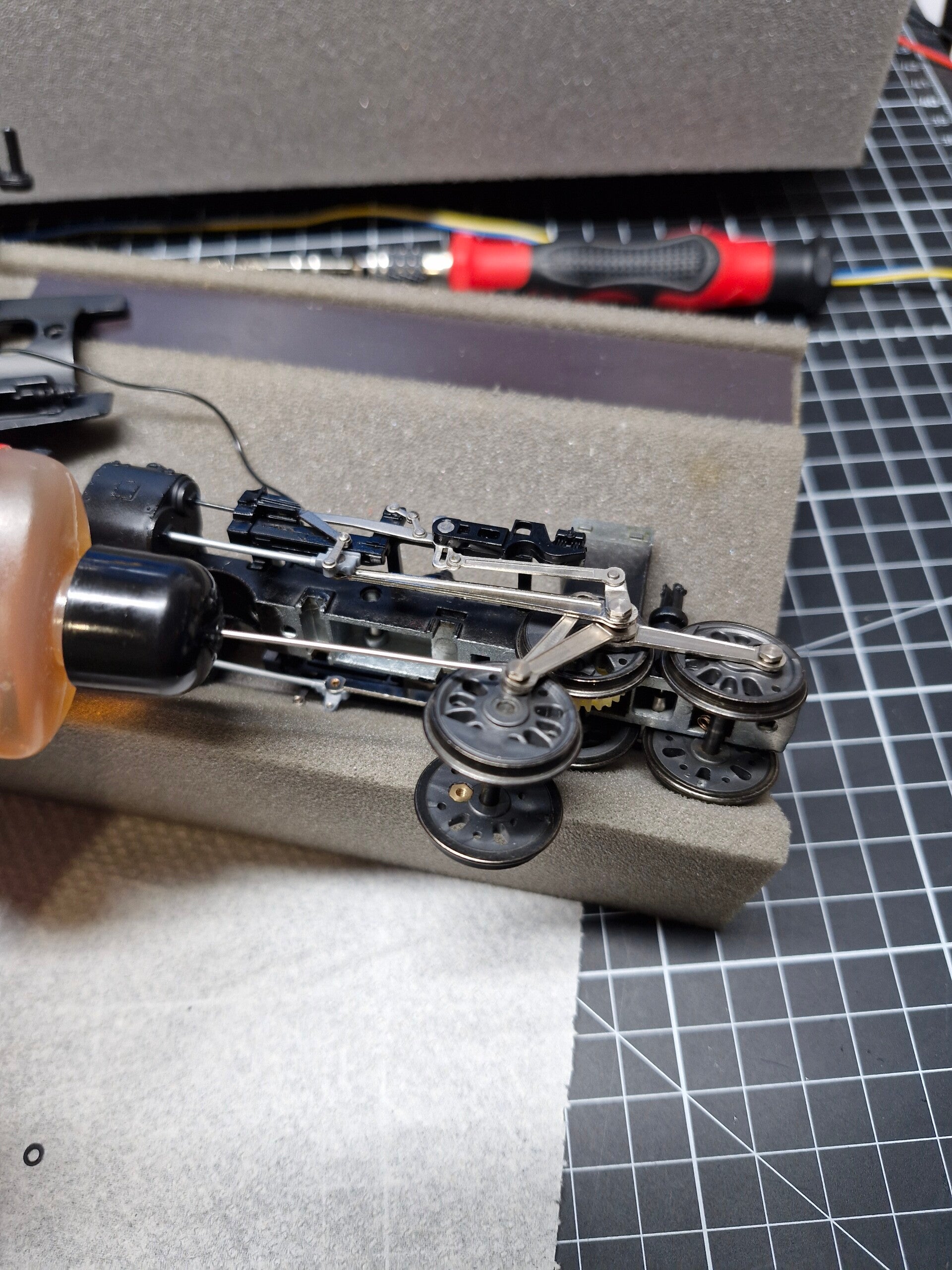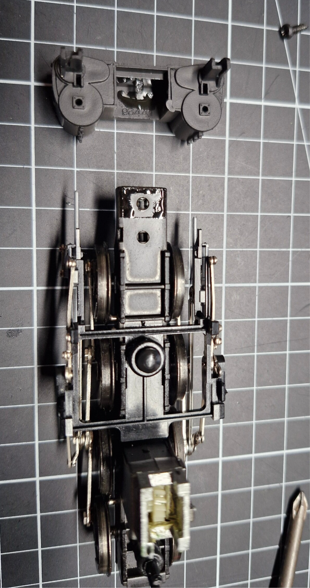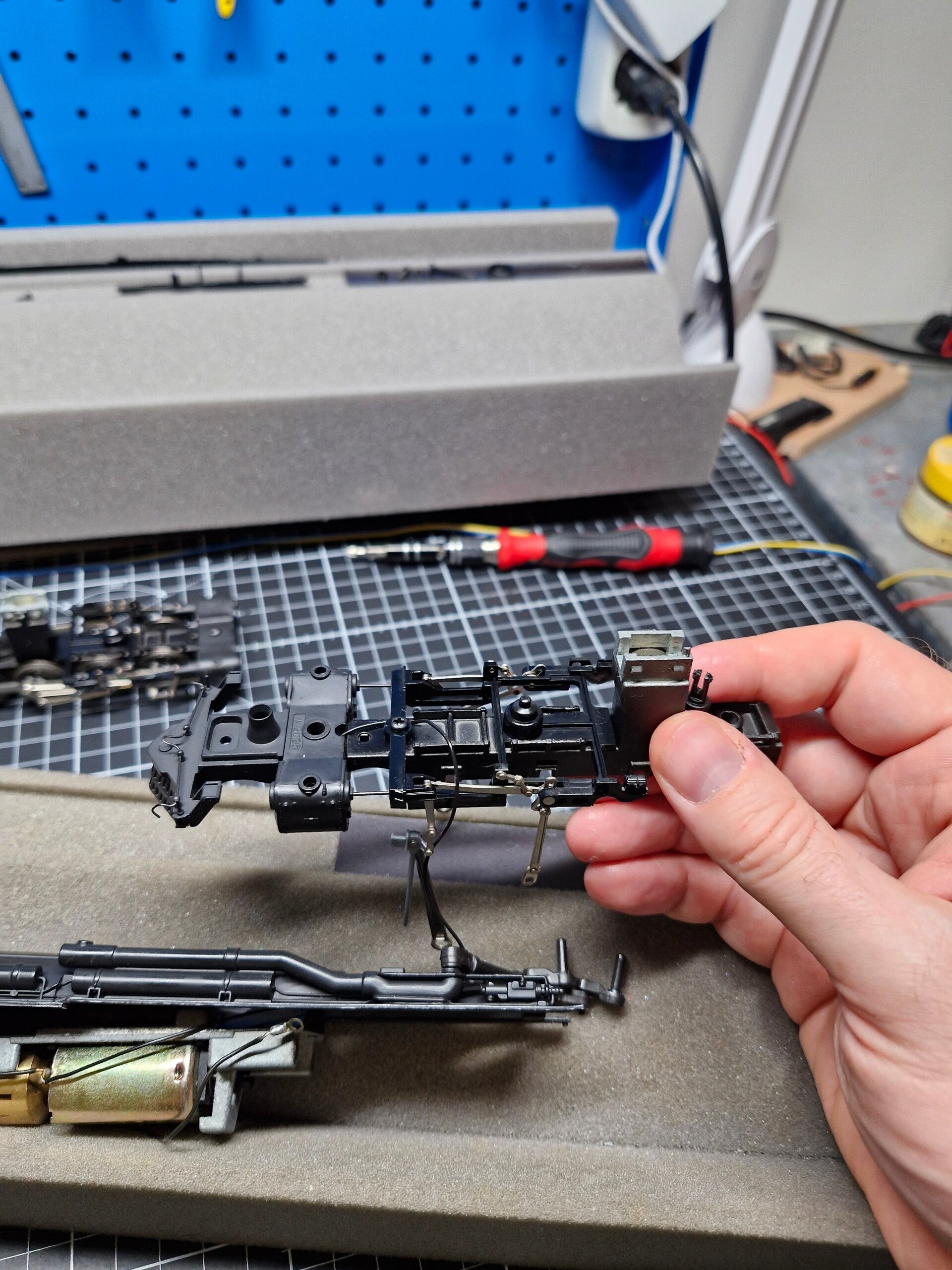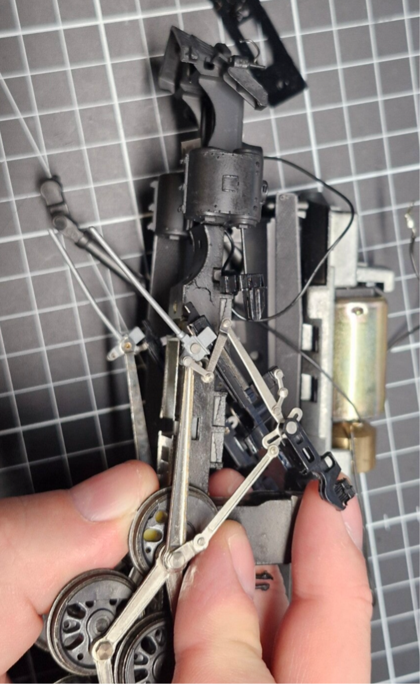 Eines der Drehgestelle war lose, das andere war noch durch eine Niete mit einem Teil des Vorderbaus verbunden. Diese Niete konnte nicht gelöst werden, weswegen wir den Vorderbau beim Rest der Wartung am Drehgestell angeheftet lassen mussten. Auch das Stromkabel für das vordere Lämpchen war am Vorderbau eingeklemmt: Man konnte sich an dieser Stelle dazu entscheiden, das Kabel abzulöten - oder den Vorderbau mit dem Motor-Aufbau verbunden zu lassen.