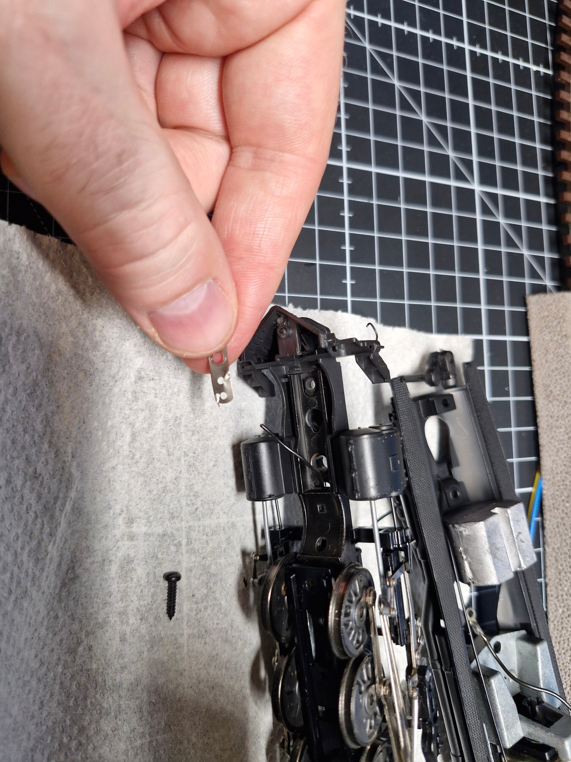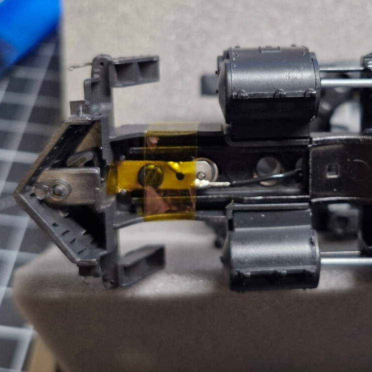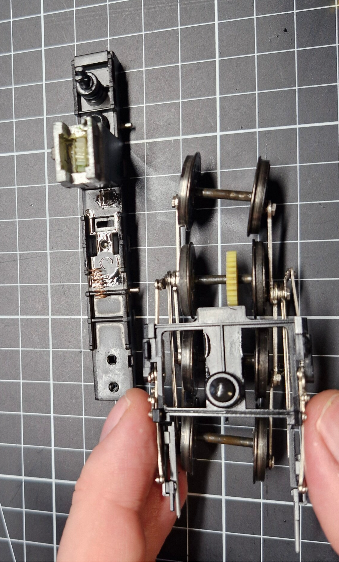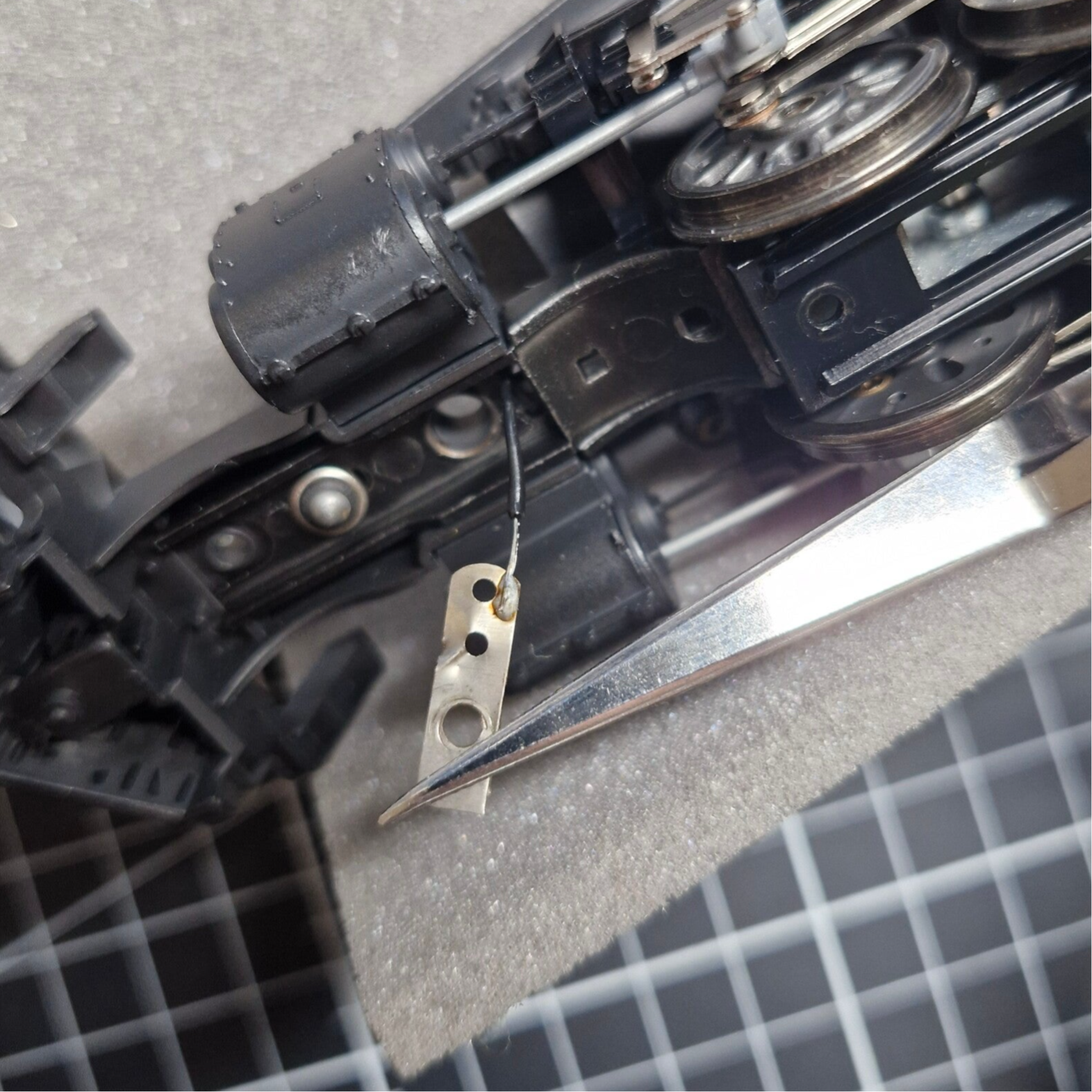 Eines der Drehgestelle war lose, das andere war noch durch eine Niete mit einem Teil des Vorderbaus verbunden. Diese Niete konnte nicht gelöst werden, weswegen wir den Vorderbau beim Rest der Wartung am Drehgestell angeheftet lassen mussten. Auch das Stromkabel für das vordere Lämpchen war am Vorderbau eingeklemmt: Man konnte sich an dieser Stelle dazu entscheiden, das Kabel abzulöten - oder den Vorderbau mit dem Motor-Aufbau verbunden zu lassen.