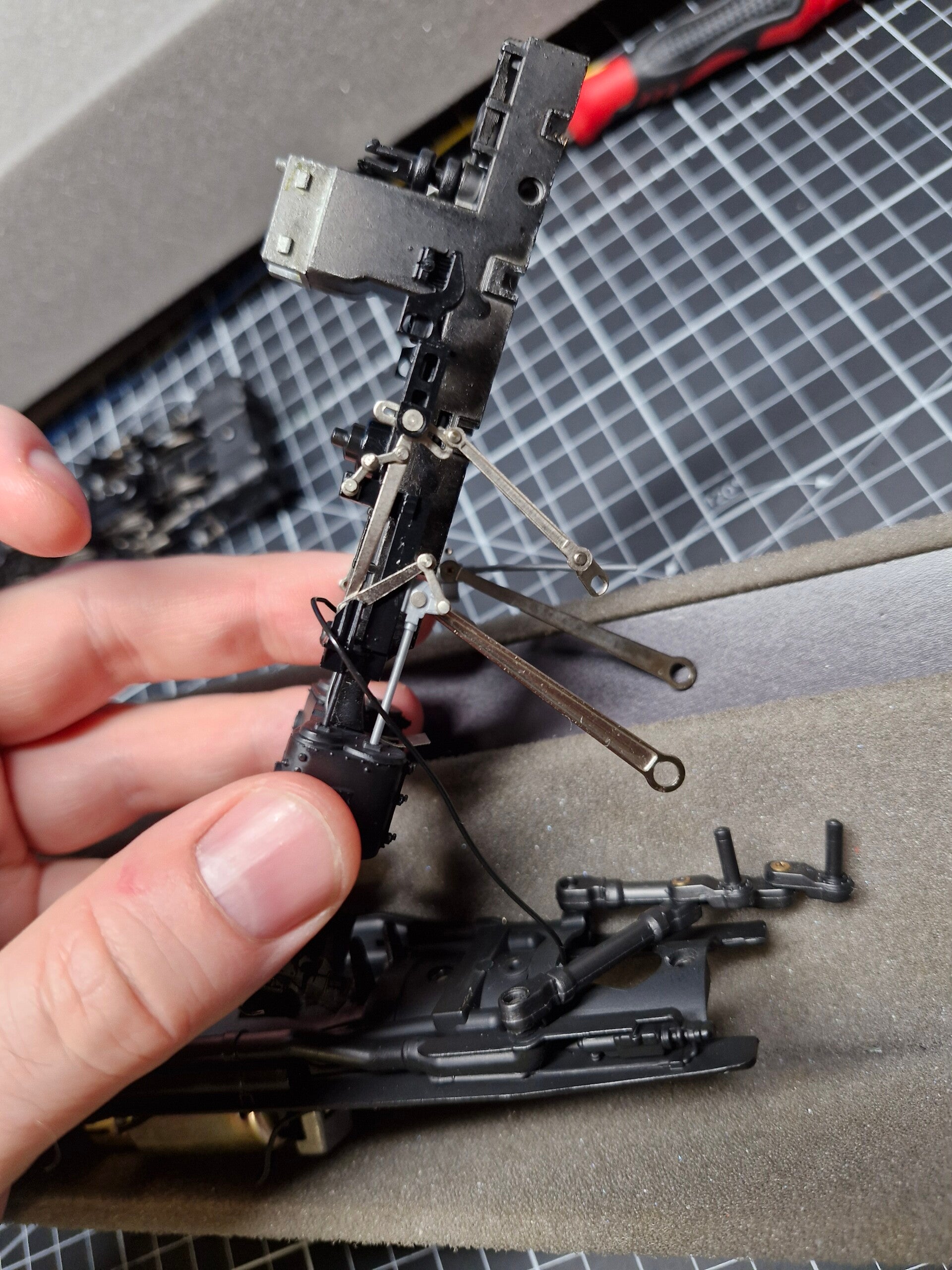 Beim Festdrücken des vorderen Steuerungsaufbaus brach leider eine der beiden Rastnasen zum einklipsen auf das Getriebegehäuse ab. Nachdem der Versuch, die Rastnase wieder festzukleben, leider fehlschlug hatten wir im Grunde 3 Möglichkeiten: Alles so zu lassen, wie es ist - oder einen Versuch zu starten, die Funktionalität der Rastnase durch etwas anderes zu ersetzen (beispielsweise eine winzige Schraube) - oder den Aufbau mit einem kleinen Tropfen Klebstoff festzukleben.