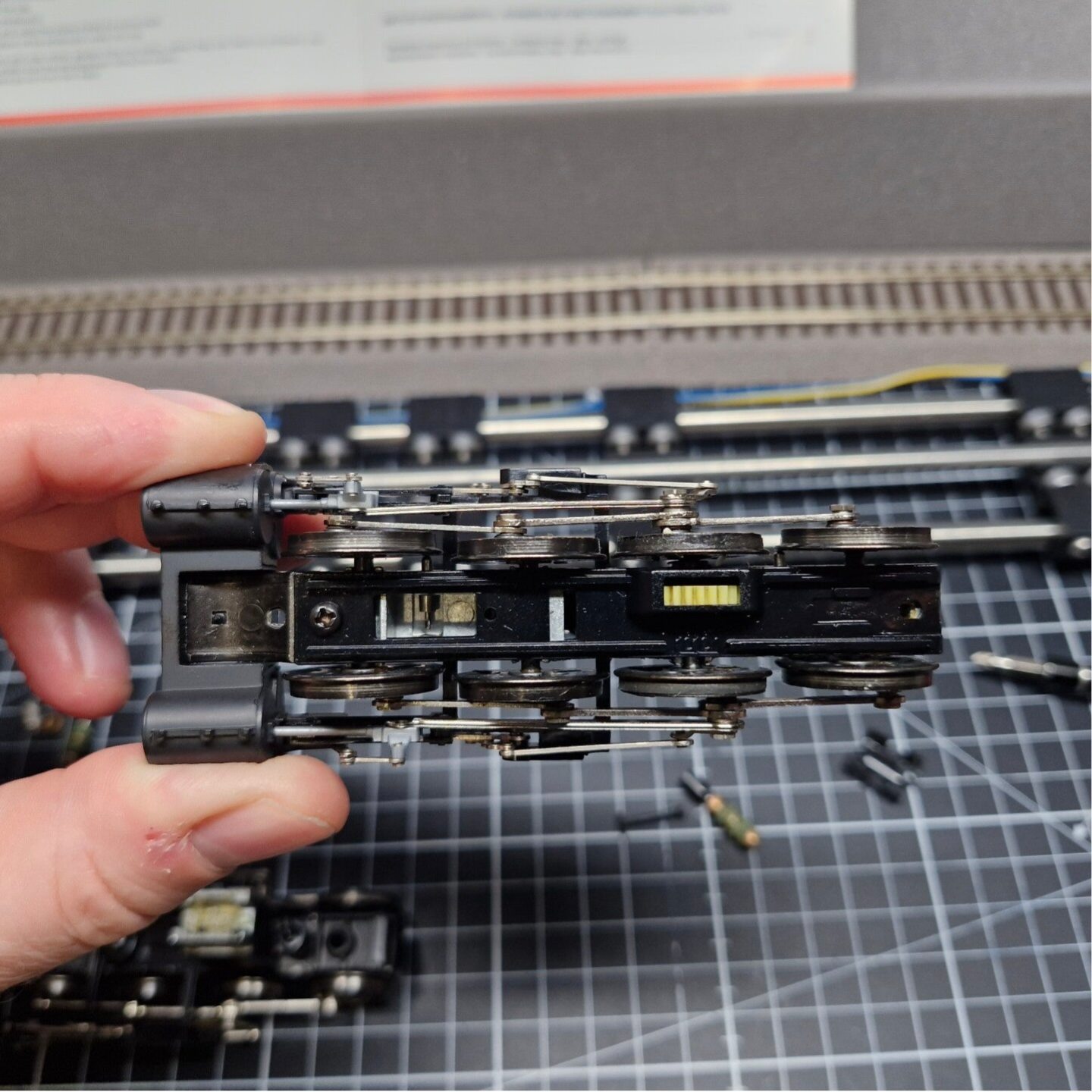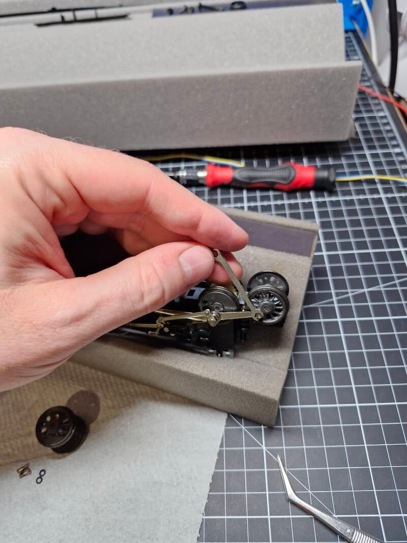 Das Gestänge der Steuerung war mittels Aussensechskant-Schrauben mit den Rädern der jeweils 4 Achsen pro Drehgestell verbunden. Um diese zu lösen benötigt man einen Mikro-Maulschlüssel der Schlüsselweite 3.0mm, welchen es beispielsweise im Set von Donau Elektronik zu kaufen gibt [5].