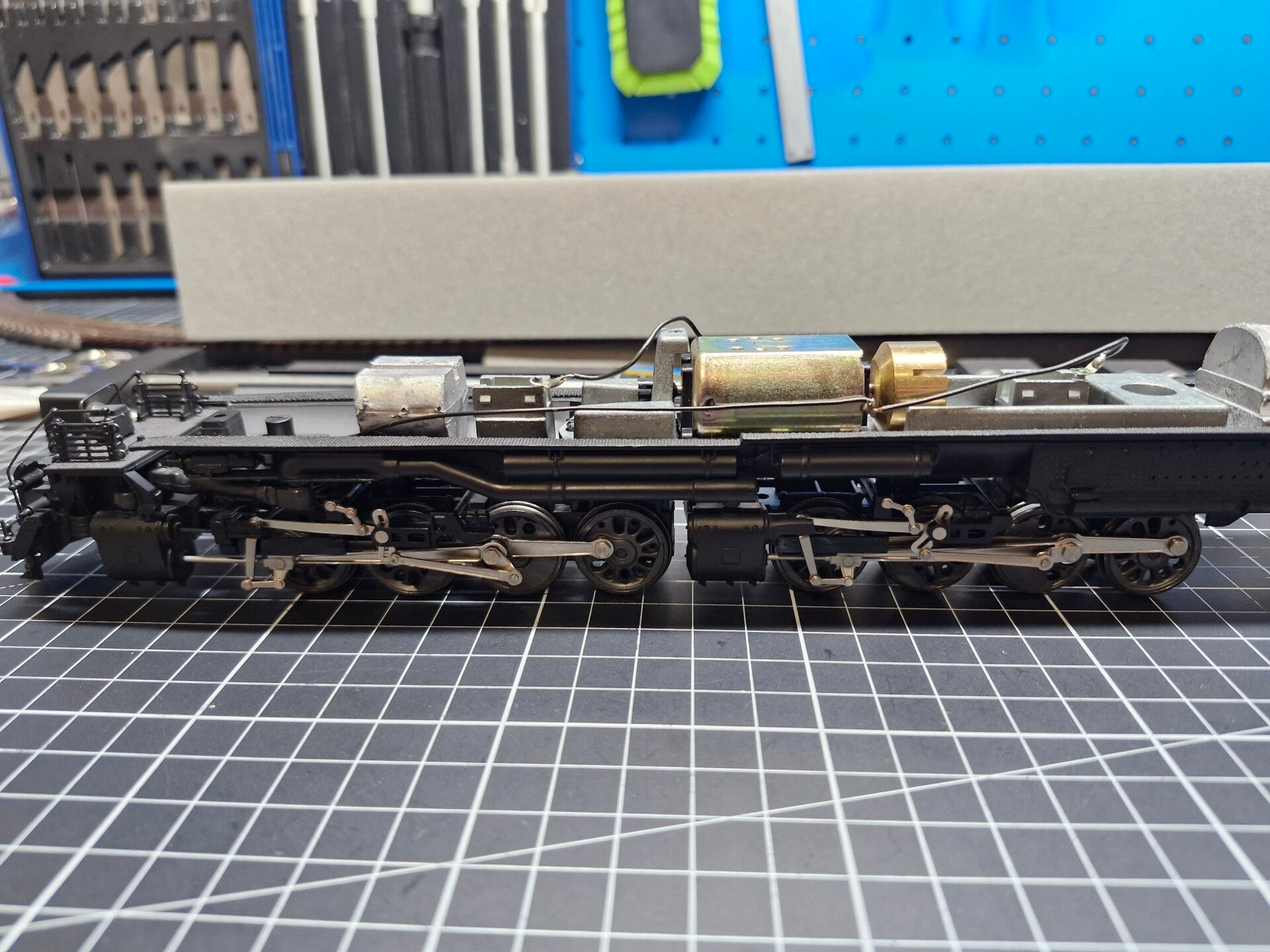 Nun wurden die Drehgestelle wieder in den Rahmen hineingeklipst. Jetzt konnten wir erstmals ausprobieren, ob die Lok zumindest auf geraden Strecken fahren konnte, ohne dass die Gestänge blockierten - erste Tests mit der Hand verliefen vielversprechend. Zu diesem Zeitpunkt waren die Gestängeschrauben noch nicht bis zum Anschlag festgeschraubt, was noch letzte Einstellungen ermöglichen sollte.