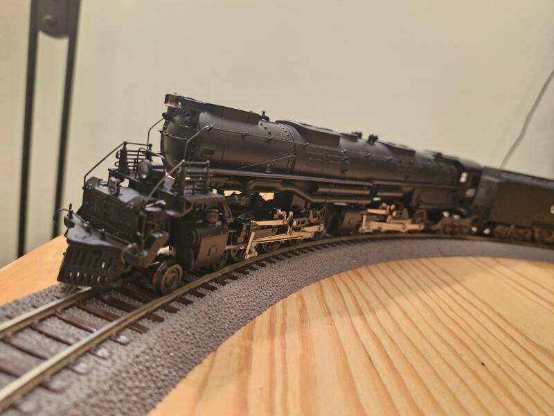 Nach einem weiteren kurzen Testlauf auf dem Rollenprüfstand war er dann Zeit für die finale Testfahrt auf der Teststrecke: Würde die Lok auch mit ihrem Tender auf einem R2-Radius bestehen? Dies war alles andere als trivial - vor allem, da zumindest ältere Big Boy-Modelle von Rivarossi nicht für solch kleine Radien ausgelegt waren.. doch die Lok schlug sich überraschend gut und brachte die Proberunden ohne grössere Probleme zu Ende: Um auf Nummer sicher zu gehen, wurde jedoch nicht mit Vollast um die Kurve gefahren [7].