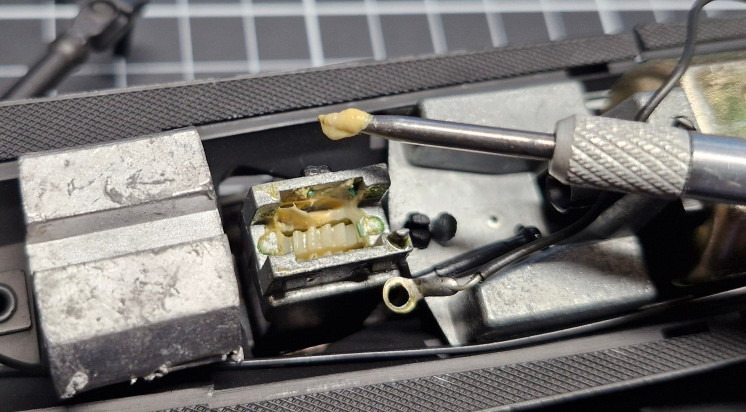 Nun war es an der Zeit, die Getriebe wieder mit dem Motor zu verbinden. Auch hier wurde Öl in die Lagerstellen sowie Spezial-Schmierfett auf die Schnecke aufgetragen. Bei diesem Modell erfolgte die Stromabnahme für einen der Motorpole zudem durch ein mit einer Öse am Getriebegehäuse festgeklemmten Kabel: Die zugehörigen Kontaktflächen wurden sogleich mit einem Glasfaserstift abgeschliffen, um bessere Stromübertragung zu ermöglichen.