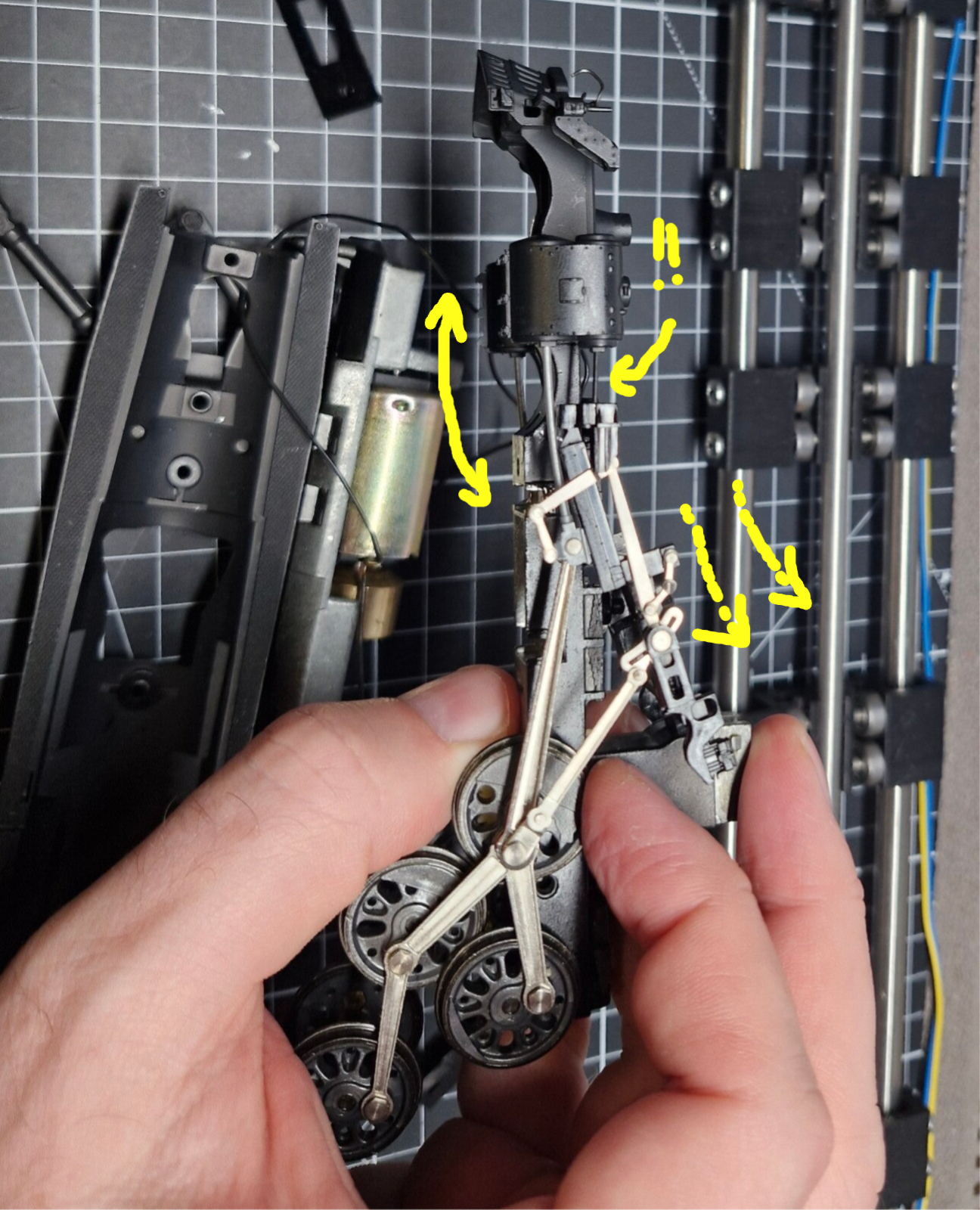 Alles so zu lassen, wie es war und die Rastnase einfach auszusparen könnte eventuell funktionieren - der gesamte Aufbau war dadurch jedoch etwas wackelig. Beim Betrieb könnte es dann zu unerwünschten Nebenwirkungen kommen welche auf dieses Problem zurückzuführen sind - beispielsweise eine blockierte Steuerung oder verkantete Kurbelstangen, zB wenn die Lok um die Kurve fährt.. daher entschieden wir uns gegen diese Möglichkeit.