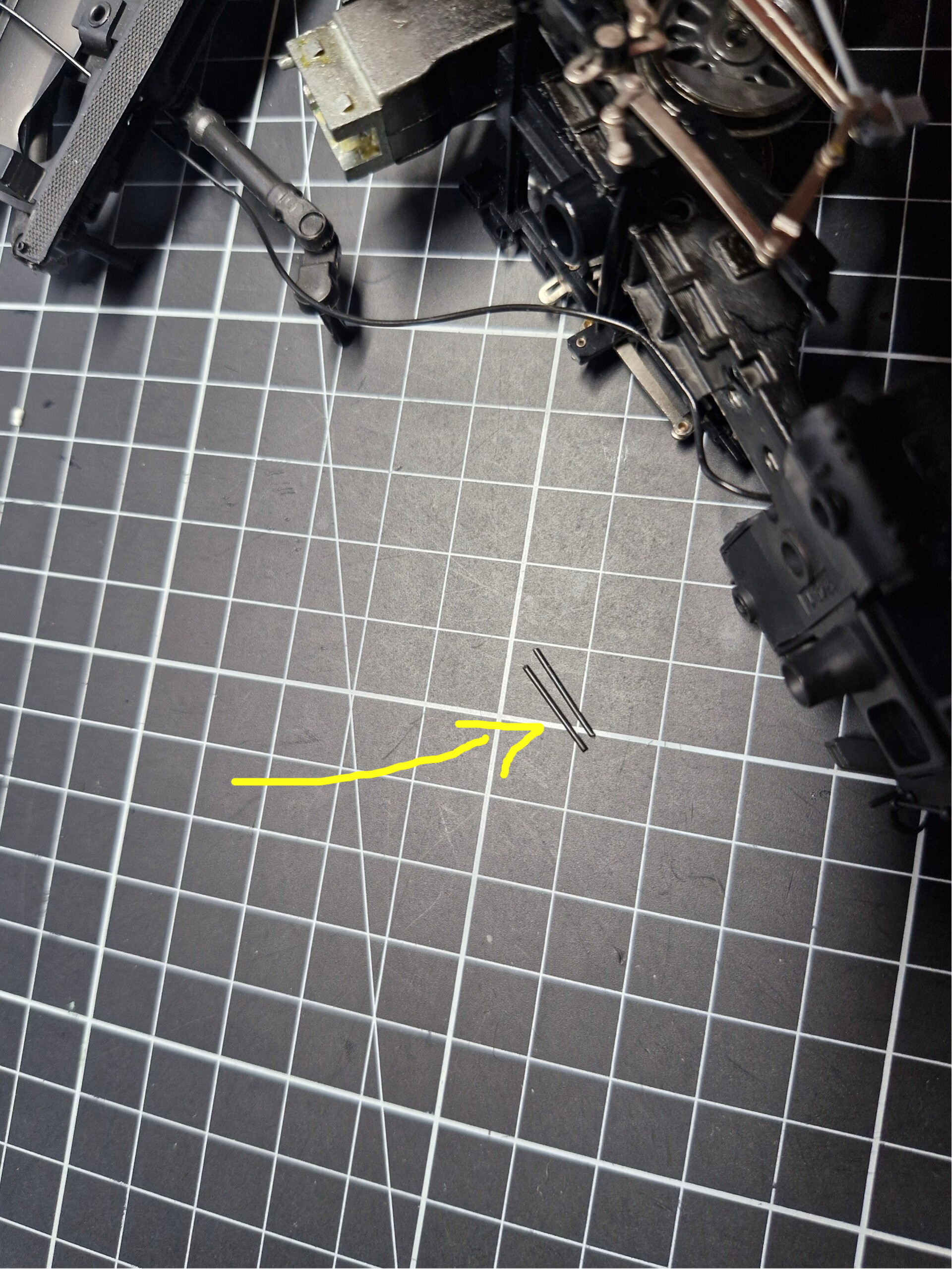 Der nächste Schritt dafür war, die beiden Mallet-Drehgestelle abzubekommen. Dies war leichter gesagt als getan: Sie wurden von zwei Spreiz-Pins in Position gehalten welche man nur dadurch abbekam, dass man sie an einem der Enden zusammendrückte und anschliessend das jeweilige Drehgestell herauszog. Dies war auch in obiger Anleitung angedeutet. Die Passung war jedoch derartig eng ausgeführt dass man aufpassen musste, die Pins und deren Rastnasen nicht zu beschädigen oder abzureissen. Mit etwas Gewalt konnten wir die Gestelle jedoch schliesslich mit einer Mischung aus Drücken, Quetschen und Drehen hinausziehen.