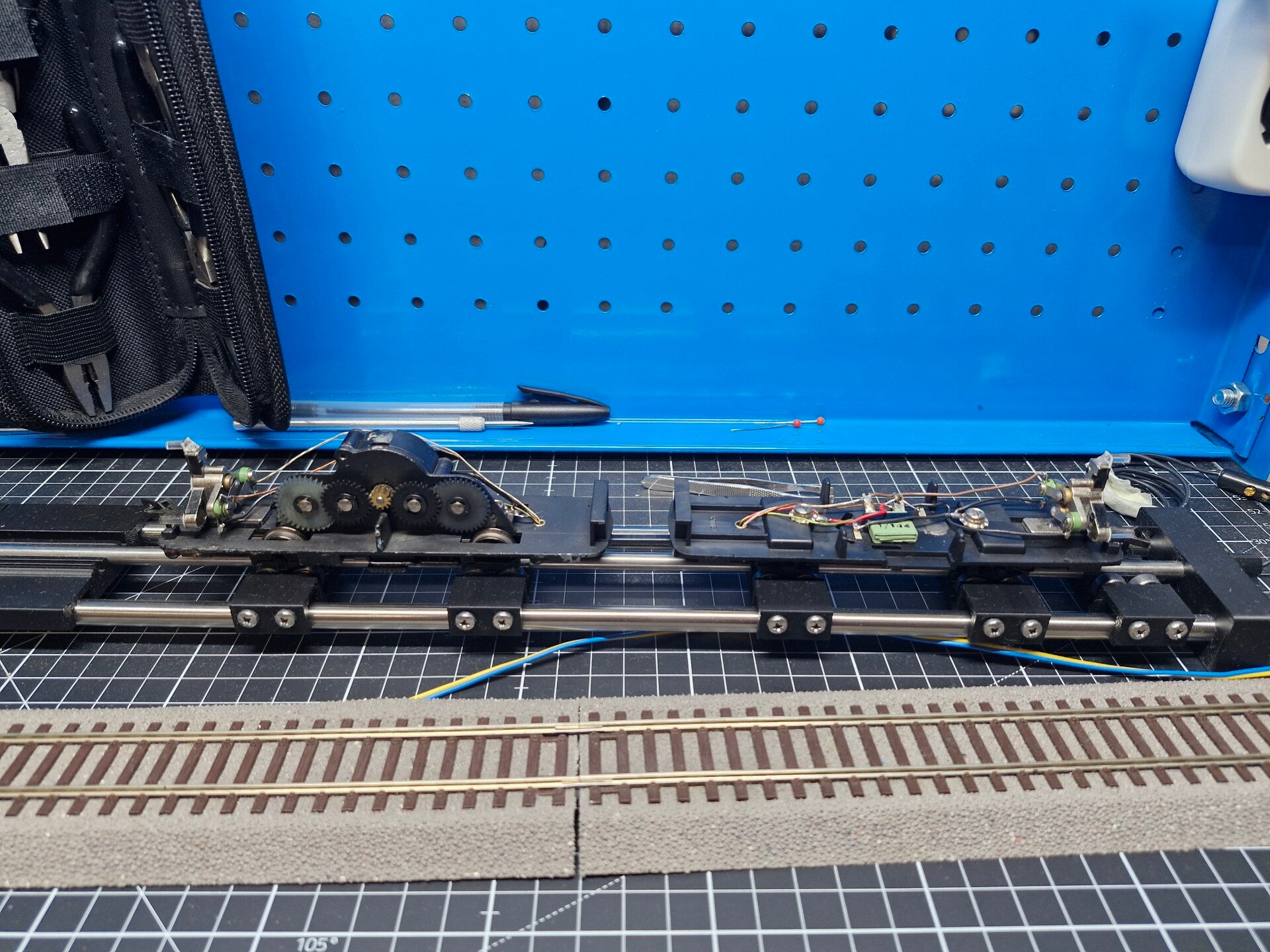 Bei den ersten Testfahrten setzte nach ein paar problemlosen Runden neben leichtem Rattern auch ein sehr lautes Quietschgeräusch ein, was auf mangelnde Schmierung der Motorlager hindeutete [5]. Abgesehen davon war der technische Zustand des Schienenbusses aber gut - sogar alle Lämpchen funktionierten noch einwandfrei, auch beim Richtungswechsel (weiss/rot), und auch die Stromabnahmefedern sowie die Haftreifen schienen noch intakt.
