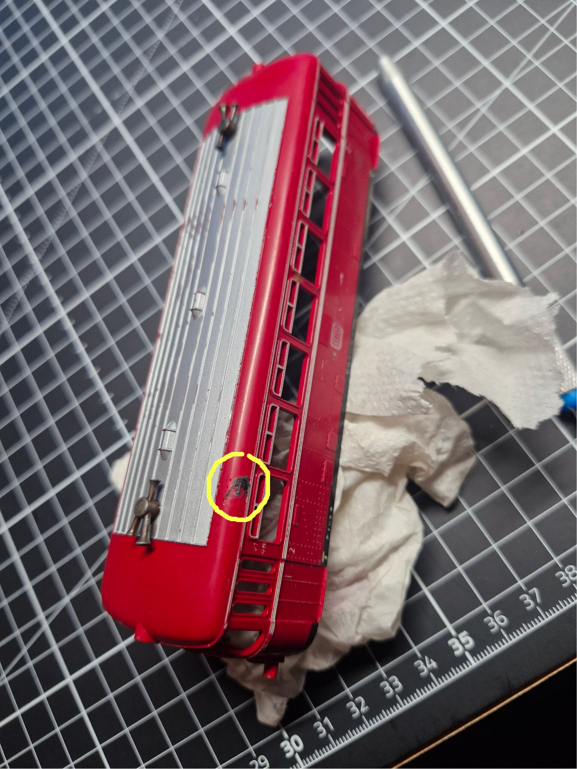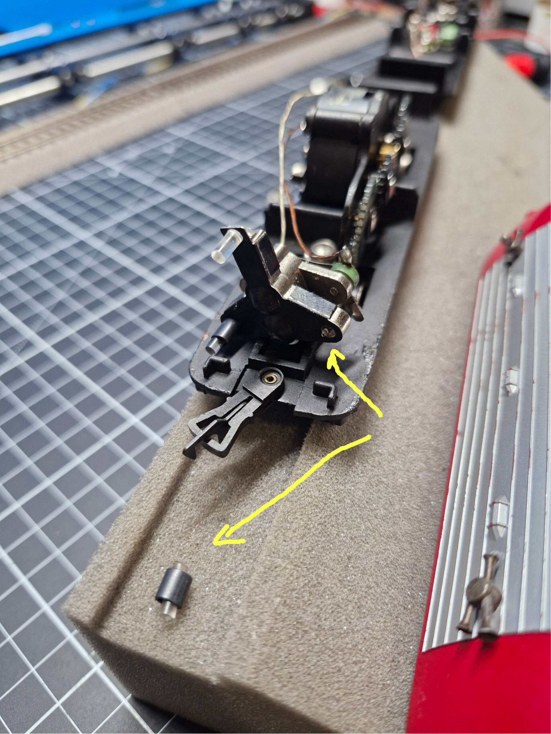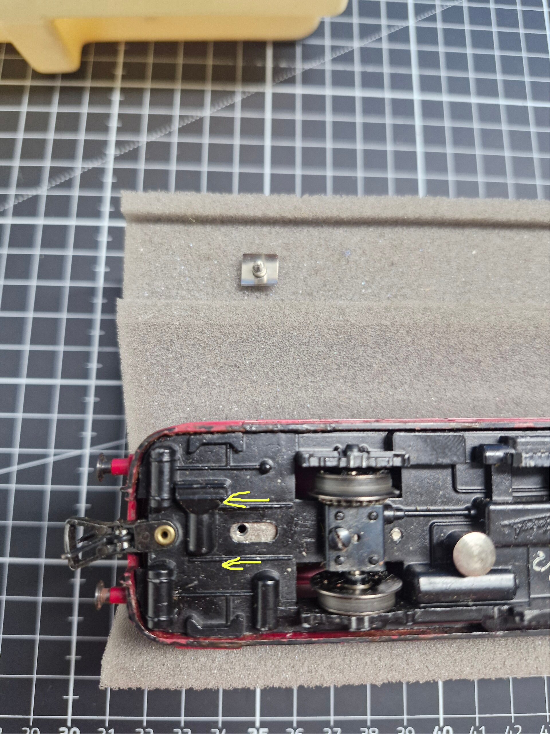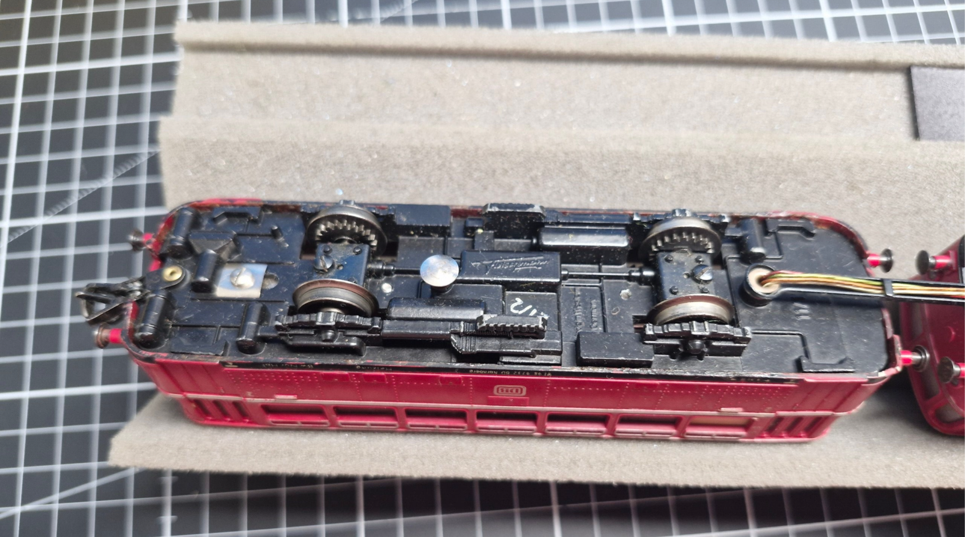 Eine Besonderheit dieses Modells ist die unlöslich verbundene Kupplung zwischen der Lok und dem Beiwagen. Die Plastikverbindung ist relativ filigran und enthält noch dazu etliche Kabel - bei allen Arbeiten ist also grösste Vorsicht geboten, um die Verbindung nicht zu beschädigen. Bei derartigen Arbeiten bietet sich insbesondere eine längere Lokliege aus Schaumstoff an, um die Wägen beim Drehen und Wenden etwas zu stabilisieren.