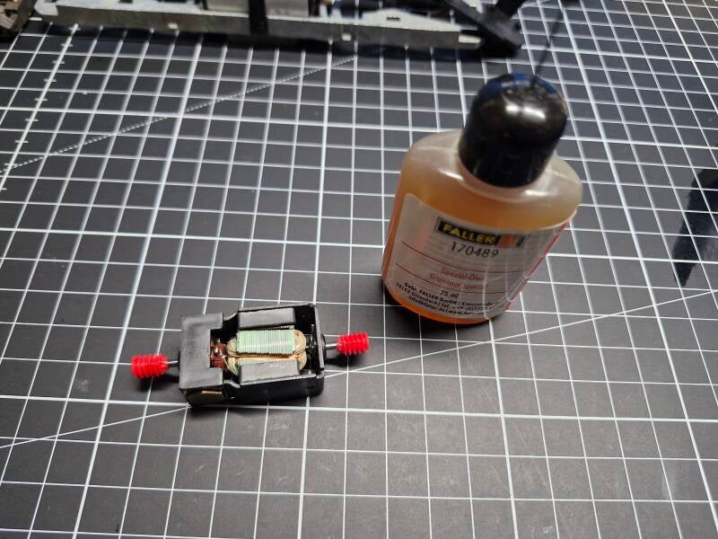 Ein kurzer Testlauf sollte nun zeigen, ob die Lok wieder lief und ob tatsächlich nur fehlende Wartung das Problem war - doch Fehlanzeige: Die Lok bewegte sich keinen Millimeter vorwärts. Nun musste also näher untersucht werden, was die Ursache sein könnte - deshalb wurde zunächst der Motor ausgebaut und mit einem Labornetzteil getestet: Er lief ohne Probleme in beide Richtungen.