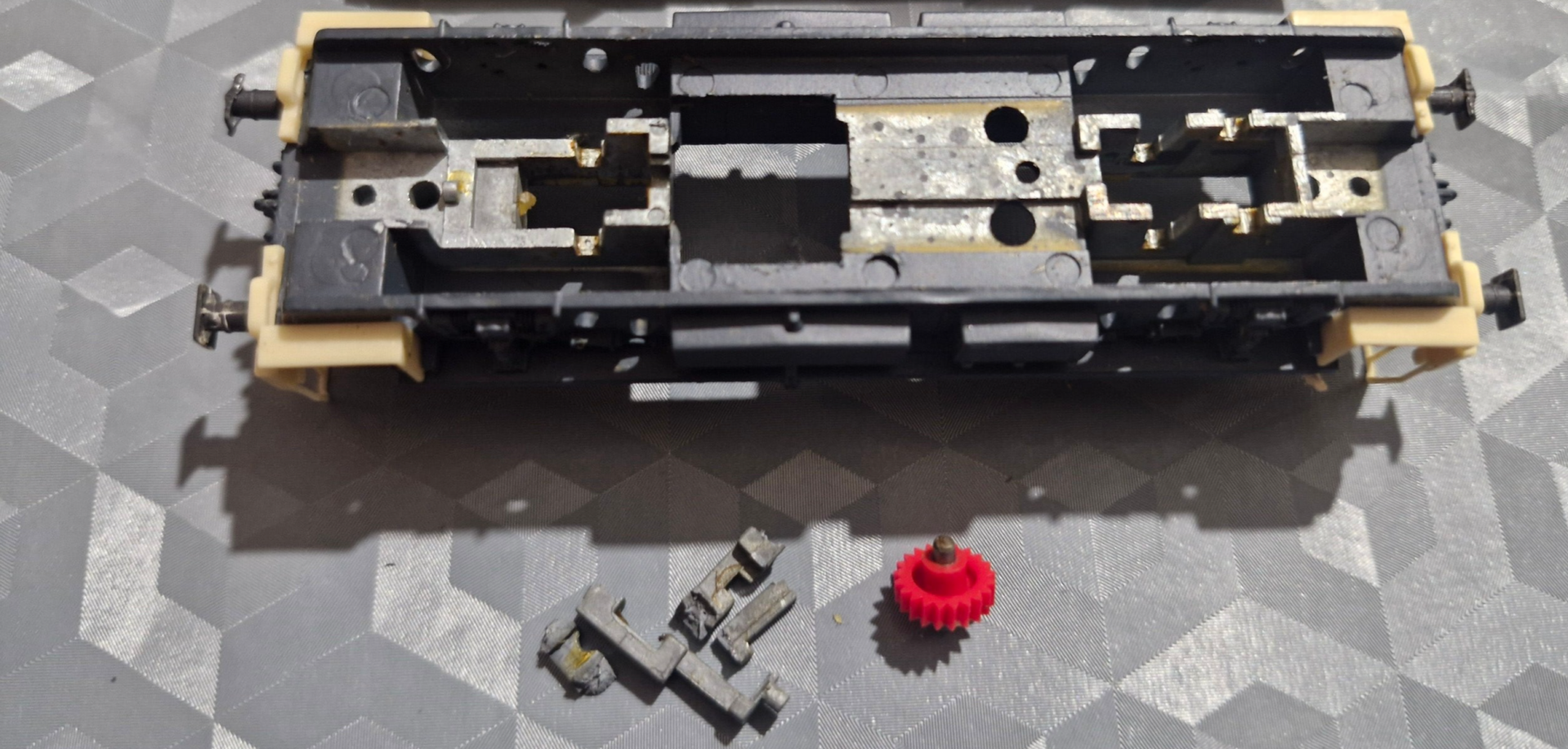 An dieser Stelle sei noch darauf hingewiesen, dass auch Teile dieser Lok leider an kristalliner Zinkkorrosion (umgangssprachlich "Zinkpest" genannt) leiden können - abhängig vom genauen Herstellungsdatum des Artikels wurden also Legierungen verwenden, welche sich ein paar Jahre danach von selbst zerlegen. Vor allem die untere, lange Getriebeabdeckung sowie die Getrieberahmen sind davon betroffen.